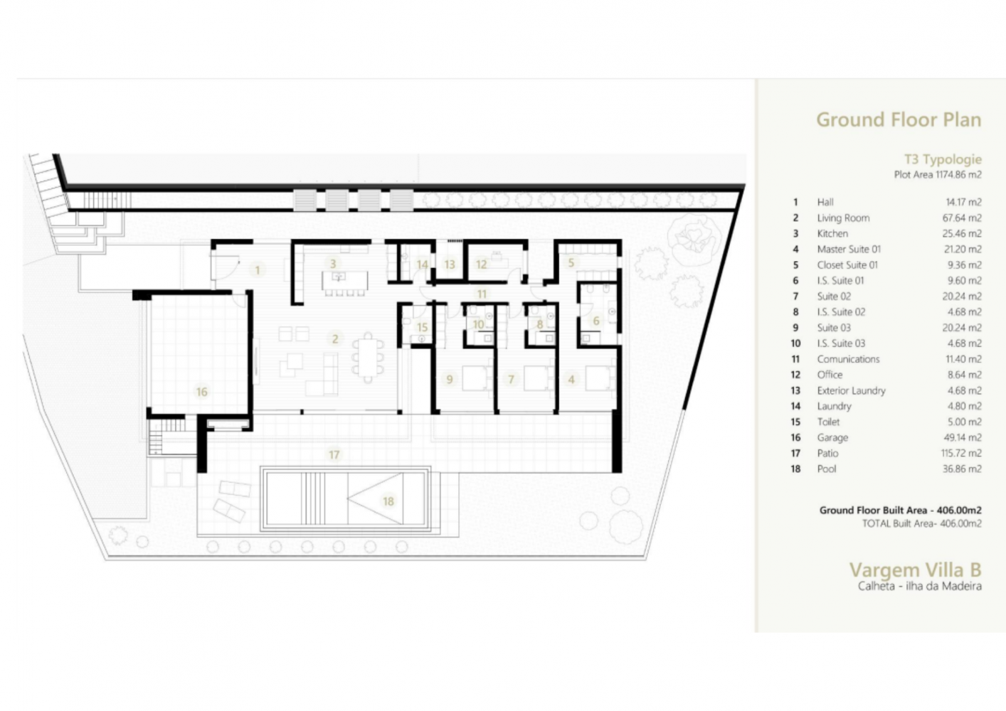 De tipologia T3 e aproximadamente 400m2 de área bruta de construção, esta habitação distribui-se em apenas um piso, encontrando-se inserida numa parcela de terreno com 1180m2, possuindo uma área exterior ajardinada muito generosa e uma piscina. Tal como referido anteriormente, a moradia distribui-se apenas num piso da seguinte forma: EXTERIOR: - Amplos jardins, lavandaria exterior, piscina, solário, barbecue, garagem (3 carros), com acesso exterior e interior com o hall principal da casa. INTERIOR: - Zona Social: um espaçoso hall de entrada que dá lugar a uma generosa sala comum em open space com a cozinha grande moderna e funcional. Toda a frente da sala sendo em vão amplo envidraçado permite a quem quer que esteja na cozinha ou na sala vislumbrar toda a paisagem exterior do jardim, piscina, solário e o mar, além de que possibilita uma maior entrada de luminosidade e arejamento de todo o espaço social. Logo a partir deste amplo espaço temos o acesso á lavandaria e á casa de banho social e á zona habitacional (quartos); - Zona habitacional: Uma vez ultrapassada a porta que separa a zona social da zona habitacional, deparamo-nos com um corredor de acesso às 3 suites e ao escritório. Duas das suites têm casa de banho privativa zona de roupeiro e acesso ao solário e piscina. A suite master embora também com casa de banho privativa dispões de uma amplo closet, 1 casa de banho generosa e também acesso ao solário e zona da piscina. A sua volumetria é sofisticada e regular, com traços comtemporâneos, materiais de qualidade, excelentes acabamentos e de pouca manutenção, que envelhecem preservando as suas características originais. Implantada de forma a usufruir ao máximo da vista infinita sobre o Atlântico e da consequente exposição solar, a Moradia B assegura o melhor enquadramento possível com a sua envolvente paisagística. O cuidado com a área verde e os arranjos paisagísticos que se pretendem implantar permitem ainda atenuar a volumetria da construção proposta, adequando-se perfeitamente ao território. Situada numa das principais cidades da ilha da Madeira, Calheta, esta Moradia encontra-se a uma proximidade da capital Funchal (a 30 min) e do Aeroporto Internacional da Madeira ( a 40 min). Venha realizar o seu sonho! Viver numa casa moderna de qualidade com piscina, vista mar numa zona tranquila, excelente exposição solar e ao mesmo tempo, perto de tudo o que é importante! Contacte-nos venha saber mais sobre este emprendimento e saiba mais sobre as vantagens que os nossos serviços lhe oferecem! _________________________________________________________________________________________________________________________________ A informação disponibilizada, embora precisa é meramente informativa, pelo que não pode ser considerada vinculativa, e poderá ser sujeita a alterações.